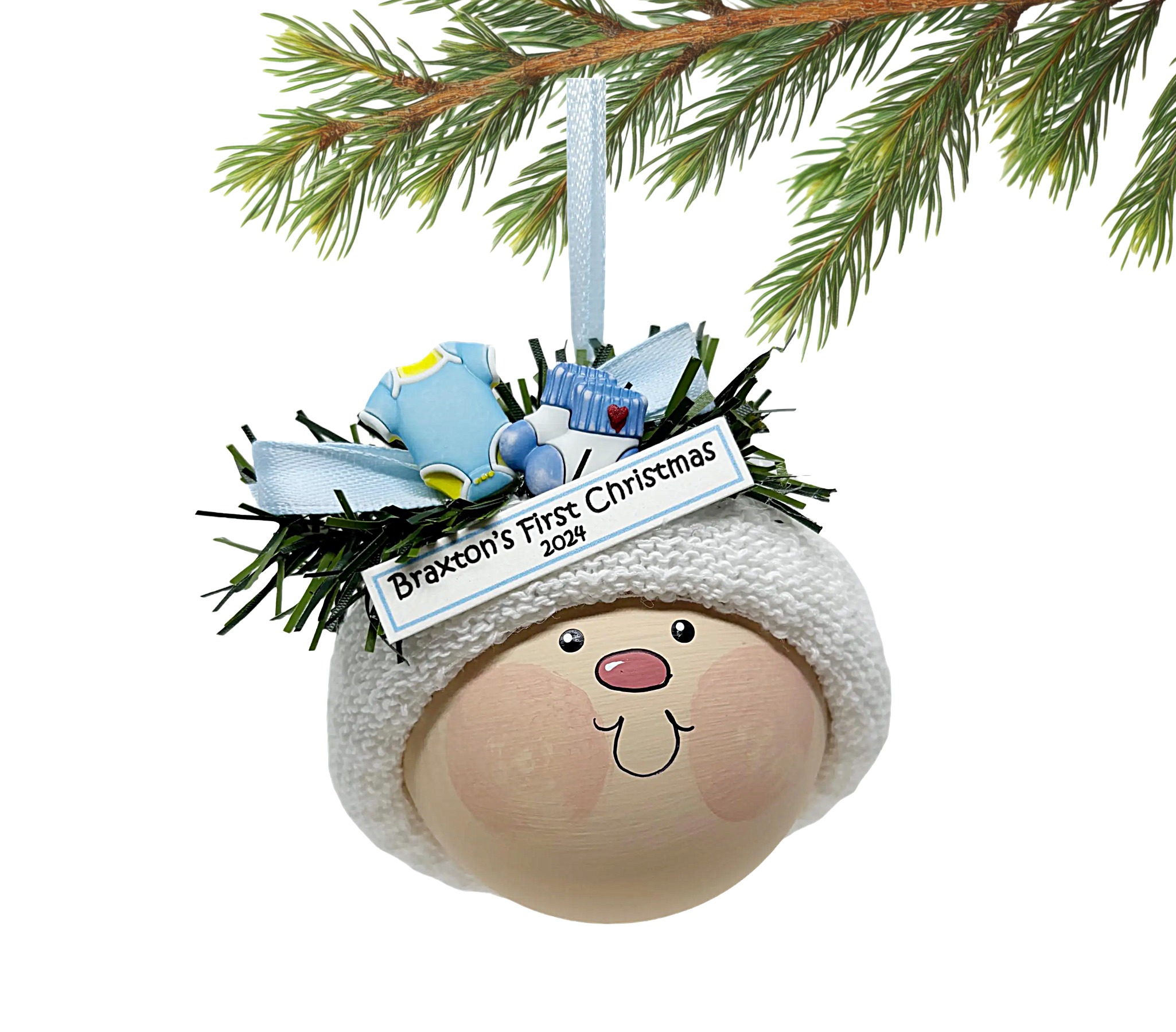 Baby Boy First 1st Christmas Ornaments White Heart BLUE CHEEKS