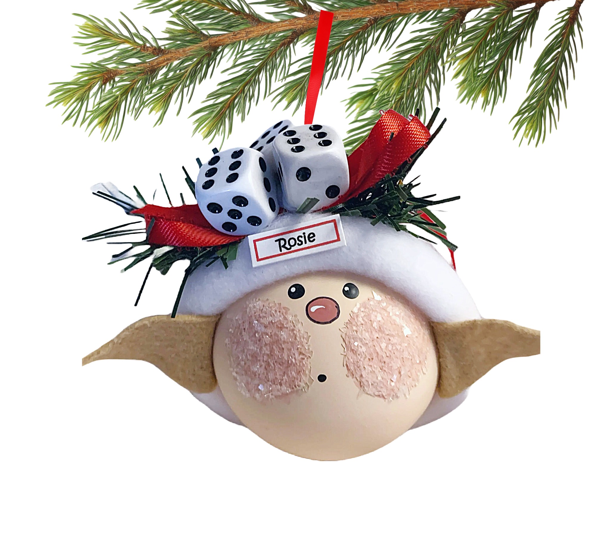 Hand painted Handmade fleece trimmed Christmas print hat Red ribbon Three dice, hand made tag Finished size approximately 3 1/2 ” to 4″